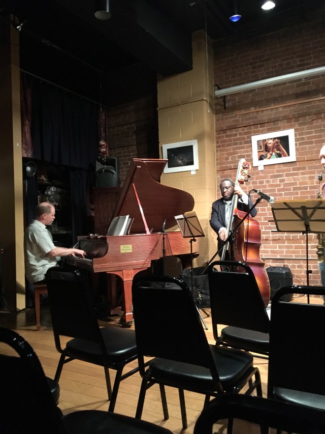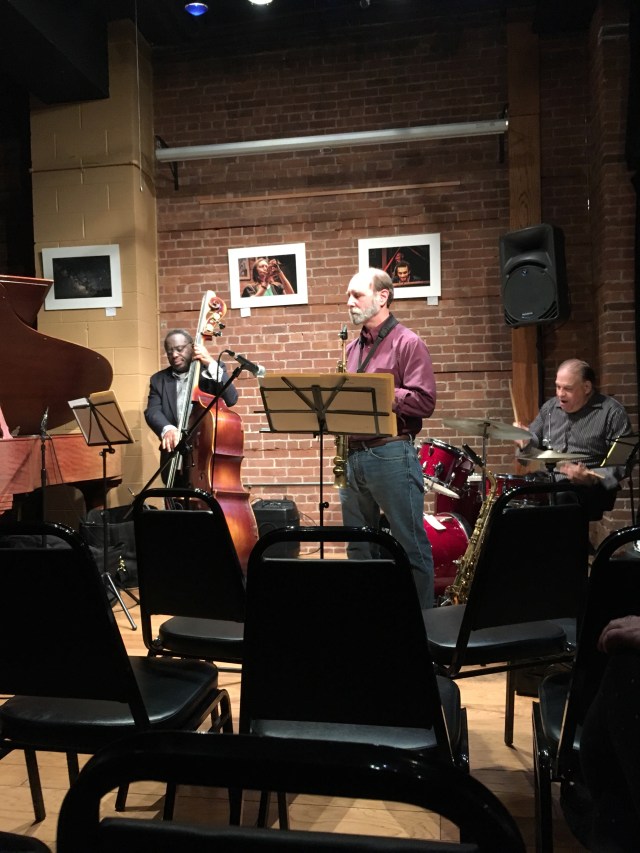 What a fun night at the Buttonwood Tree on Main Street in Middletown. Just 11 of us in the audience, the performance felt very intimate. Piano, bass, drum, and saxophone. The performance was in the cozy back room of the coffee shop. There were tall brick walls. Some lighting overhead. Thick dark blue velvet curtains dampen the sounds of Main Street. My eyes wander to the slight part in the curtains, exposing a slice of Main Street on a Friday night.