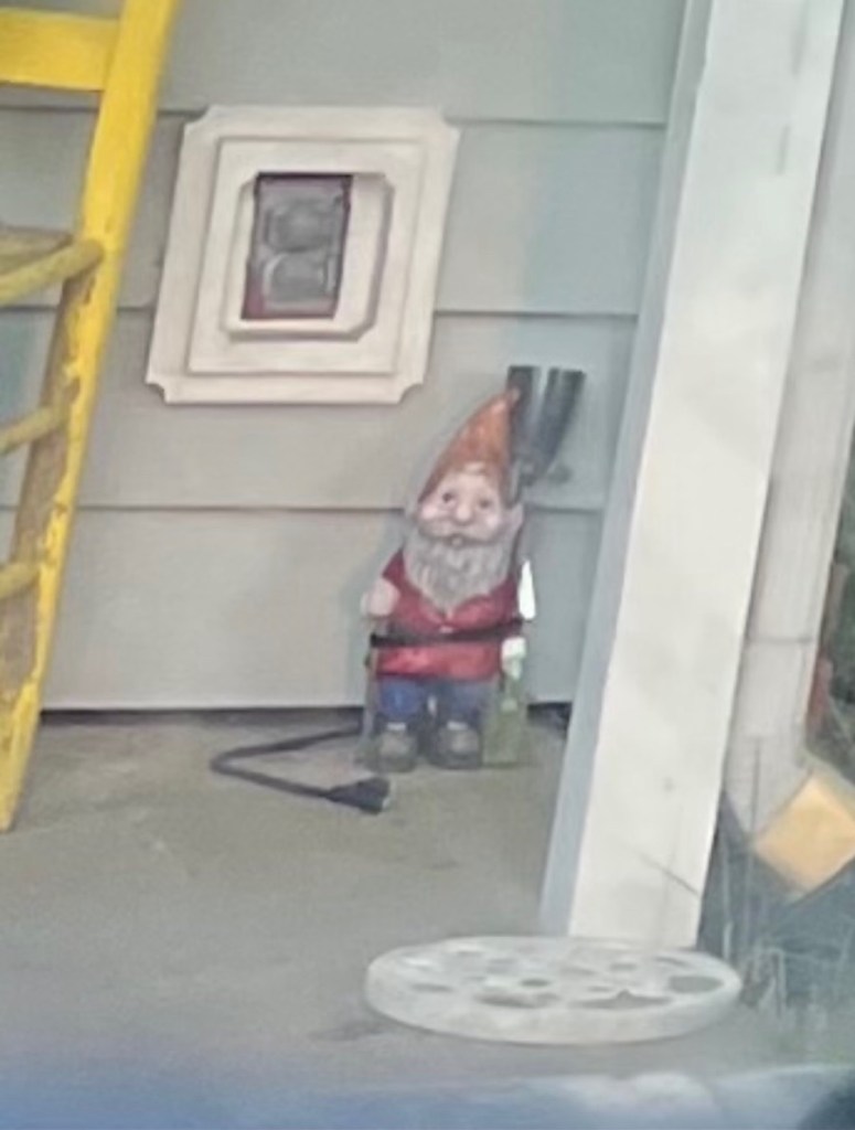 Today, I decided to relieve one of my front lawn gnomes of his duty of holding a front pathway light. Because his arms are molded to his sides, I provided him support with this job by using a black hair elastic. My youngest son awoke me in the middle of the night looking for a black hair elastic, so here I am at a more reasonable hour getting it back for him.
